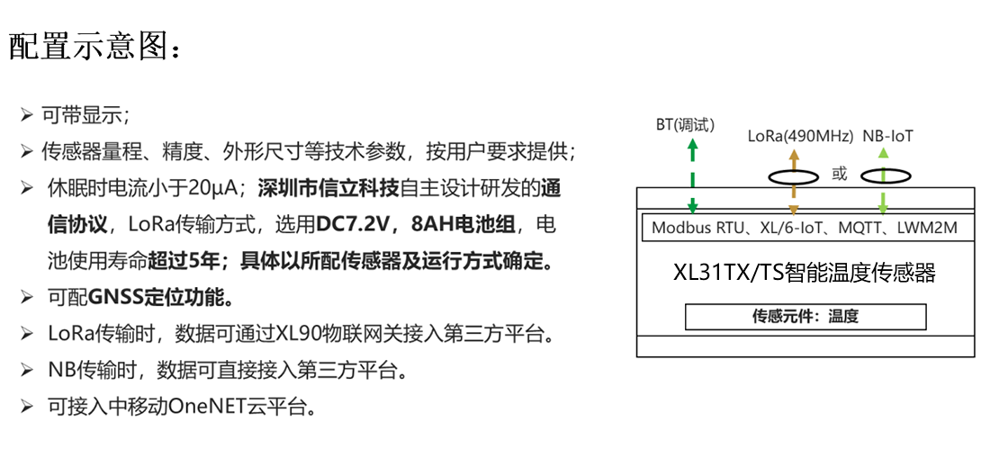 XL31TX/TS智能溫度傳感器,集成傳感元件、信息處理、無線通訊、電池供電等于一體。通訊中斷保存數(shù)據(jù),通訊恢復(fù)重傳數(shù)據(jù),超限主動上傳數(shù)據(jù),電池能量低上傳報警數(shù)據(jù)。