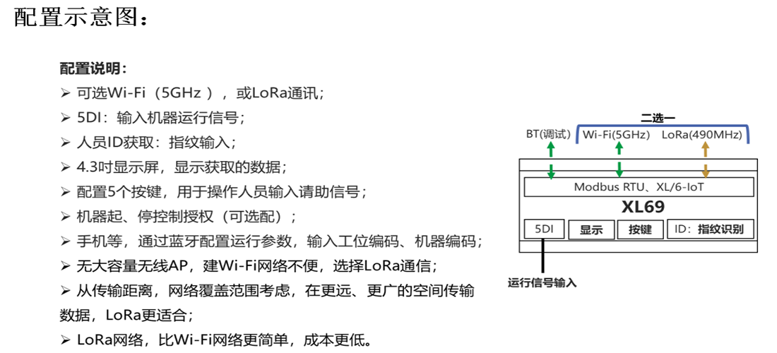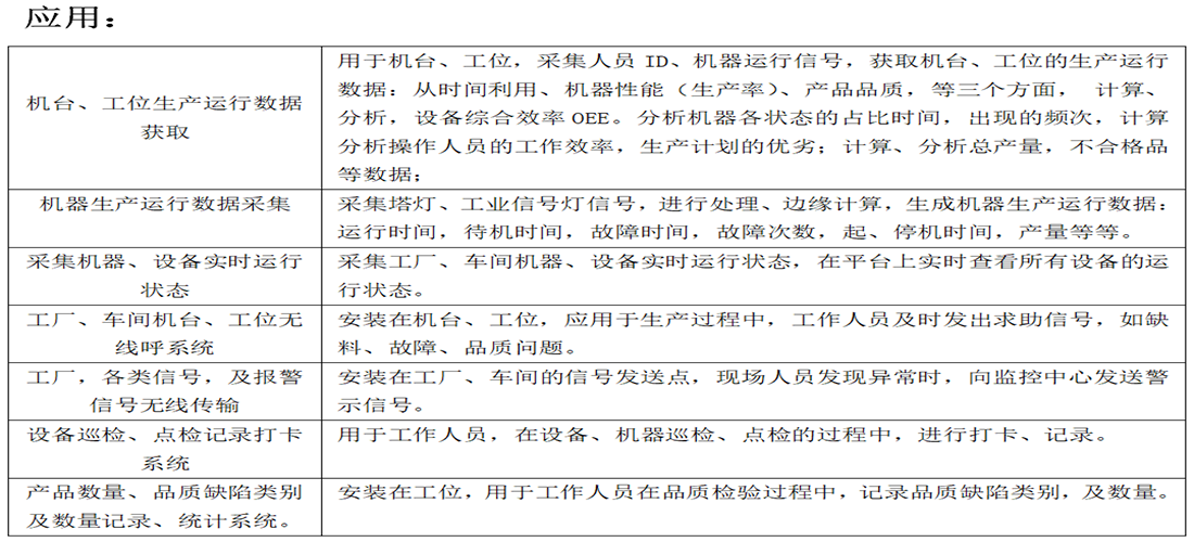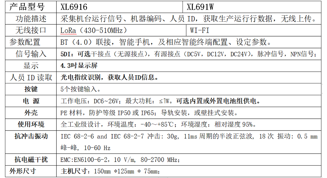XL69機(jī)臺監(jiān)控裝置,采集機(jī)臺、工位人、機(jī)生產(chǎn)運(yùn)行信號:機(jī)器運(yùn)行狀態(tài)、人員ID信息及操作時(shí)間數(shù)據(jù),獲取機(jī)器、人員生產(chǎn)運(yùn)行數(shù)據(jù),并對機(jī)臺的運(yùn)行數(shù)據(jù)進(jìn)行邊緣計(jì)算,統(tǒng)計(jì)、分析機(jī)臺的設(shè)備效率、時(shí)間效率、品質(zhì)效率,及綜合效率。通過無線方式,上傳獲取的數(shù)據(jù)。