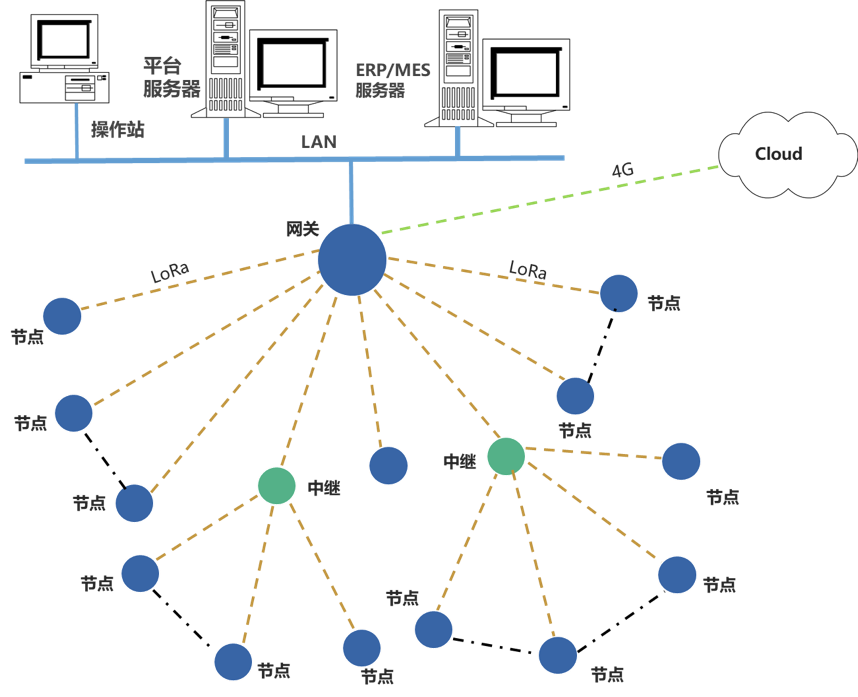 LoRa網(wǎng)絡(luò)是自定義通訊參數(shù)的LoRa通信網(wǎng)絡(luò);設(shè)計有中繼可延長無線傳輸距離。物聯(lián)網(wǎng)關(guān)對節(jié)點的數(shù)據(jù)進(jìn)行通信協(xié)議轉(zhuǎn)換,可選多種通信接口、不同的通信協(xié)議,同時上傳數(shù)據(jù)至多個平臺服務(wù)器。