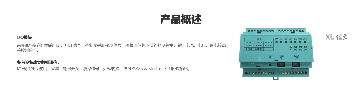 XL I/O模塊,采集模擬、開關(guān)信號,輸出模擬、開關(guān)信號,通過XBUS接口,接入XL80無線通信信主機,XL60無線采集裝置,或XL66串口無線轉(zhuǎn)換器。