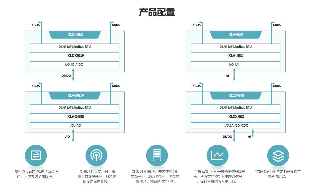 每個模塊有兩個XBUS總線接口,方便現(xiàn)場擴展聯(lián)接。XBUS可當(dāng)作RS485口使用。I/O模塊上有撥碼開關(guān),非常方便設(shè)定通信參數(shù)。可安裝在PLC柜、變頻器柜、動力控制柜、控制箱、操作臺,等現(xiàn)場控制柜內(nèi)。