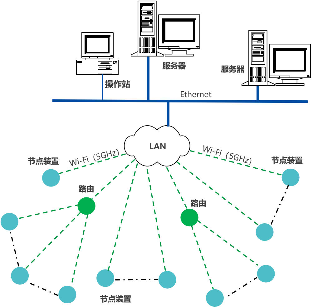 節(jié)點裝置(采集點裝置),通過Wi-Fi(5GHz),接入企業(yè)內部LAN,推送設備生產數據,至企業(yè)生產監(jiān)控平臺