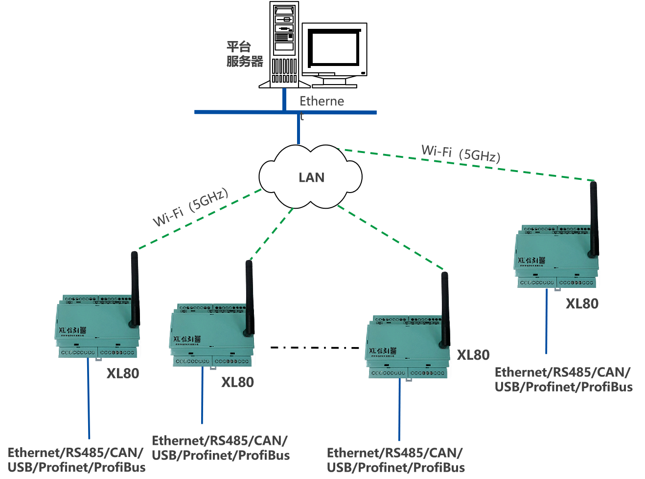 XL80智能主機,通過Ethernet、CAN、USB、Profibus、 Profinet、RS485等接口,讀取數據;支持Wi-Fi傳輸