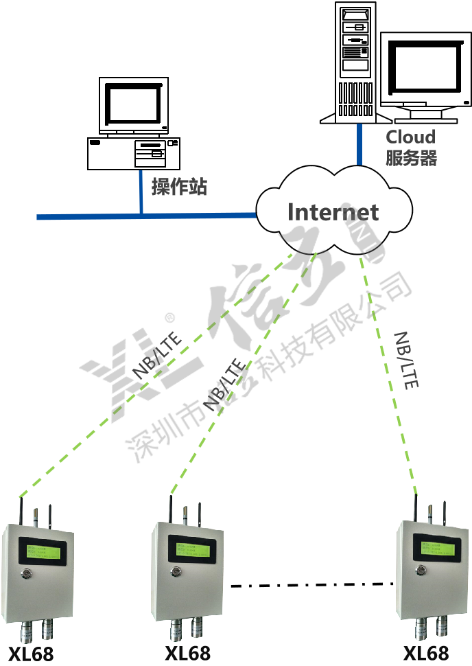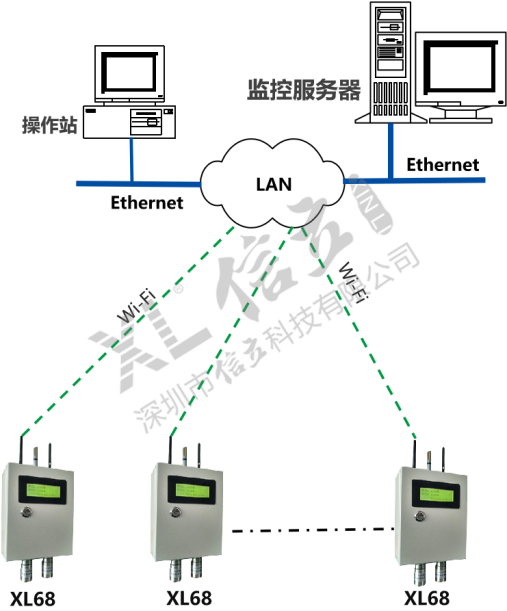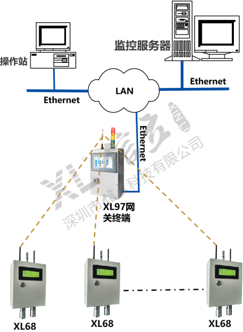 如增加現(xiàn)場集中監(jiān)控點(diǎn),可配置XL97網(wǎng)關(guān)終端,讀取區(qū)域內(nèi)XL68上傳的數(shù)據(jù),分析處理、顯示、報(bào)警,并轉(zhuǎn)發(fā)至監(jiān)控中心服務(wù)器。