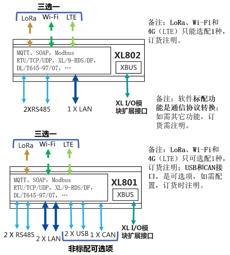 2、I/O模塊可選:XLDX(4DI/0-4DO)、XLAI(0-4AI)、XLAO(0-4AO);