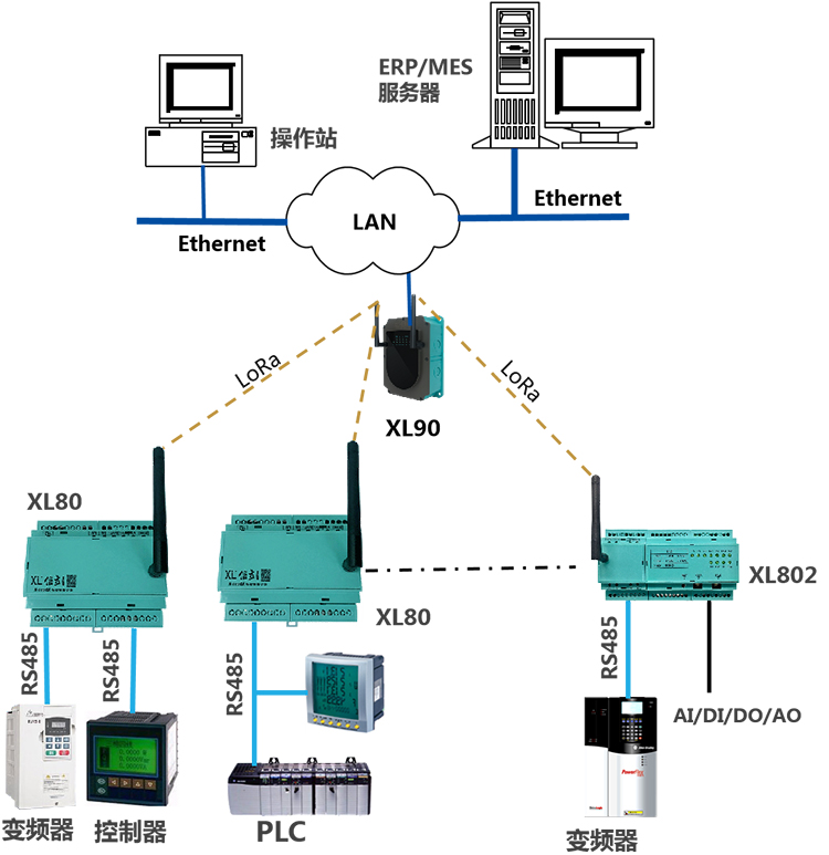 對(duì)采集點(diǎn)數(shù)據(jù)量小,需要Ethernet、RS485、CAN、USB 等通信接口讀取數(shù)據(jù),要聯(lián)接多臺(tái)設(shè)備,選擇XL80智能主機(jī),配置LoRa通信。