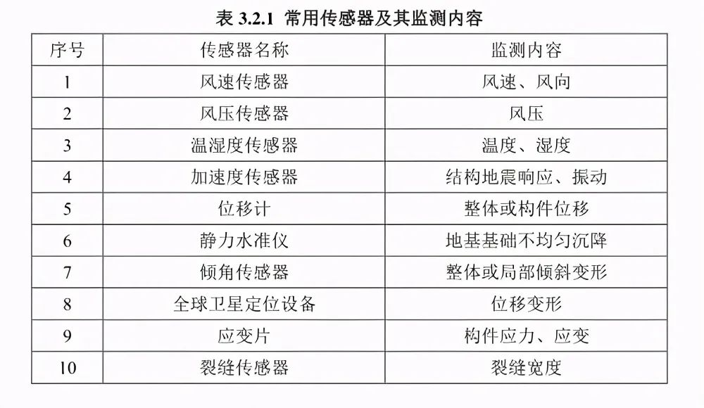作為結(jié)構(gòu)檢測最為重要的內(nèi)容,傳感器起到了最為關(guān)鍵的作用。從結(jié)構(gòu)檢測常用的傳感器類型來看,風速傳感器、風壓傳感器、溫濕度傳感器、加速度傳感器、位移計、裂縫傳感器這些都是必備的,常用的傳感器及監(jiān)測指標見下圖。