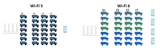 我們可以將路由器向設(shè)備傳輸?shù)膱?chǎng)景比喻成一個(gè)車(chē)隊(duì),在WiF i5標(biāo)準(zhǔn)下,同一時(shí)刻出發(fā)車(chē)隊(duì)只能派送到一個(gè)客戶,即使有空車(chē)也照常發(fā)車(chē),如果有車(chē)出現(xiàn)故障(受干擾),整個(gè)車(chē)隊(duì)都無(wú)法發(fā)車(chē)。而在WiFi 6標(biāo)準(zhǔn)下,同一時(shí)刻出發(fā)的一個(gè)車(chē)隊(duì),可以將相鄰的最少26輛車(chē)組成一個(gè)小隊(duì),每個(gè)小隊(duì)可以派送到不同的客戶,如果有車(chē)出現(xiàn)故障(受干擾)只影響所在的小隊(duì)。