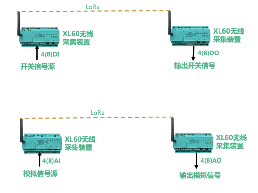 選擇兩臺(tái)XL60無線采集裝置,以一對(duì)一的無線傳輸方式,實(shí)現(xiàn)模擬、開關(guān)信號(hào)無線傳輸: