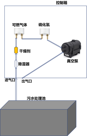 l 過程:用聚四氟乙烯管,聯(lián)接整個(gè)氣體通路。管直接伸入污水池,聯(lián)接控制箱進(jìn)氣口,氣體從進(jìn)氣口,至過濾器、除濕器,至傳感器探頭進(jìn)、出氣口(兩臺(tái)傳感器的進(jìn)、出氣口串聯(lián)),至真空泵抽氣口,從真空泵排氣口聯(lián)接控制箱出氣口;