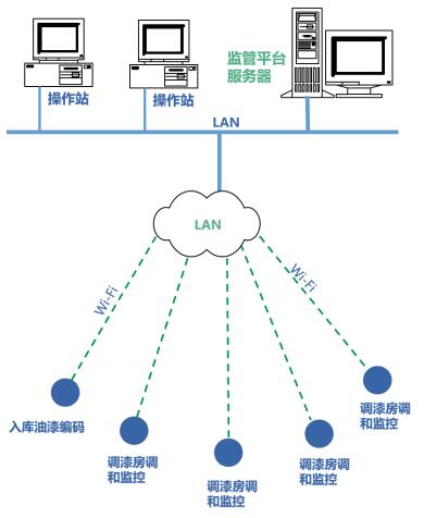 設(shè)計油漆調(diào)和監(jiān)管系統(tǒng),由監(jiān)管平臺服務(wù)器、油漆調(diào)和操作監(jiān)控終端、電子枰、油漆編碼終端、操作站等構(gòu)成,通過工廠內(nèi)的局域網(wǎng)(WI-FI)進(jìn)行通信連接。