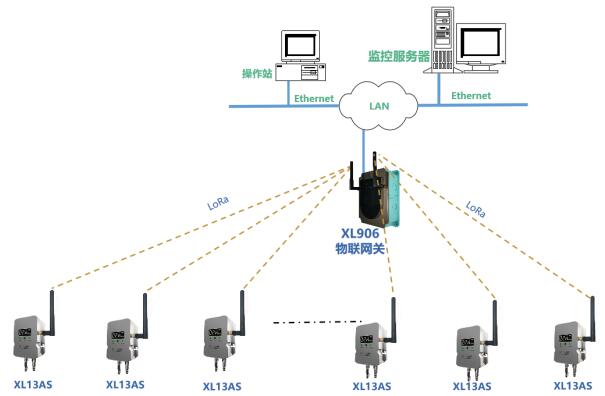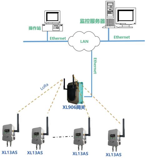方案一:根據(jù)現(xiàn)場(chǎng)實(shí)際情況,部署XL906物聯(lián)網(wǎng)關(guān),XL13AS無線風(fēng)管風(fēng)速傳感器通過LoRa無線傳輸數(shù)據(jù)至XL906物聯(lián)網(wǎng)關(guān),網(wǎng)關(guān)可選Ethernet、Wi-Fi、4G等多種方式將風(fēng)速數(shù)據(jù)傳輸至監(jiān)控平臺(tái)。