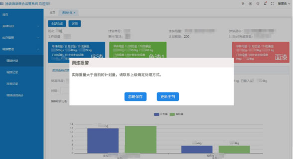 智能更新料重:當某種原料倒入過多,系統(tǒng)彈窗報警,經(jīng)上級權限確認后系統(tǒng)根據(jù)給定配比,自動更新各原料所需重量。