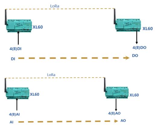 選擇一對(duì)基于LORA無線傳輸模塊的XL60主機(jī),其中一臺(tái)配置在現(xiàn)場(chǎng)采集端,通過RS485采集現(xiàn)場(chǎng)儀表的電流、電壓、開關(guān)等信號(hào),另一臺(tái)配置在控制儀表端,通過RS485PLC、控制機(jī)臺(tái)、顯示儀表等連接,現(xiàn)場(chǎng)采集端的XL60可將采集到的數(shù)據(jù)通過LORA無線對(duì)傳到控制儀表端的XL60并上傳至控制儀表。