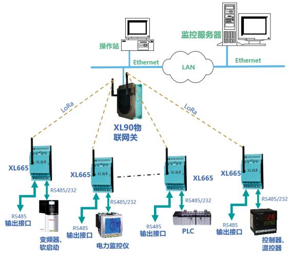 通過(guò)LoRa無(wú)線傳輸模塊輸出的數(shù)據(jù),可上傳至XL90物聯(lián)網(wǎng)關(guān)接入監(jiān)控軟件平臺(tái),或通過(guò)XL66串口無(wú)線轉(zhuǎn)換器,與PLC、觸摸屏等通信。
