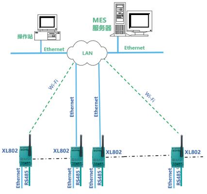 設(shè)備接入:對于安裝分散,離LAN接口遠(yuǎn)的設(shè)備,設(shè)計(jì)XL80安裝在LAN口附近接入局域網(wǎng),選擇XL66無線轉(zhuǎn)換器,連接設(shè)備RS485/RS232接口,實(shí)現(xiàn)設(shè)備無線連接XL80通信主機(jī)。