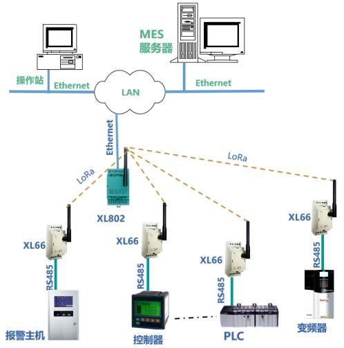 數(shù)據(jù)聯(lián)網(wǎng):XL80主機(jī)通過LoRa無線傳輸技術(shù),從XL66無線讀取設(shè)備的運(yùn)行數(shù)據(jù),通信協(xié)議轉(zhuǎn)換處理后,通過Ethernet轉(zhuǎn)發(fā)數(shù)據(jù)至MES或監(jiān)控平臺。