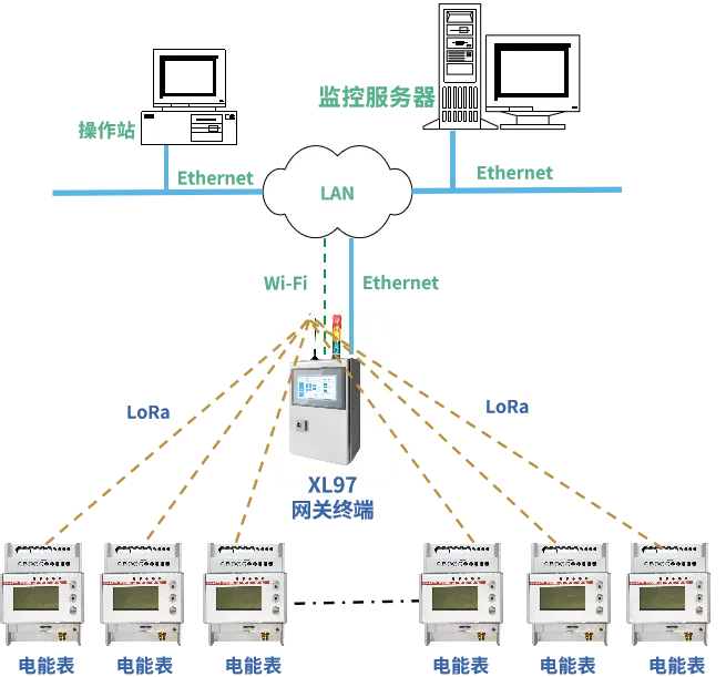DTSD3366D/XL系列三相電子式電能表,通過LoRa無線傳輸電流數(shù)據(jù)至XL97網(wǎng)關(guān)終端,可實現(xiàn)就地監(jiān)控;XL97網(wǎng)關(guān)終端通過Ethernet或Wi-Fi推送數(shù)據(jù)至監(jiān)控平臺,實現(xiàn)遠(yuǎn)程監(jiān)控。
