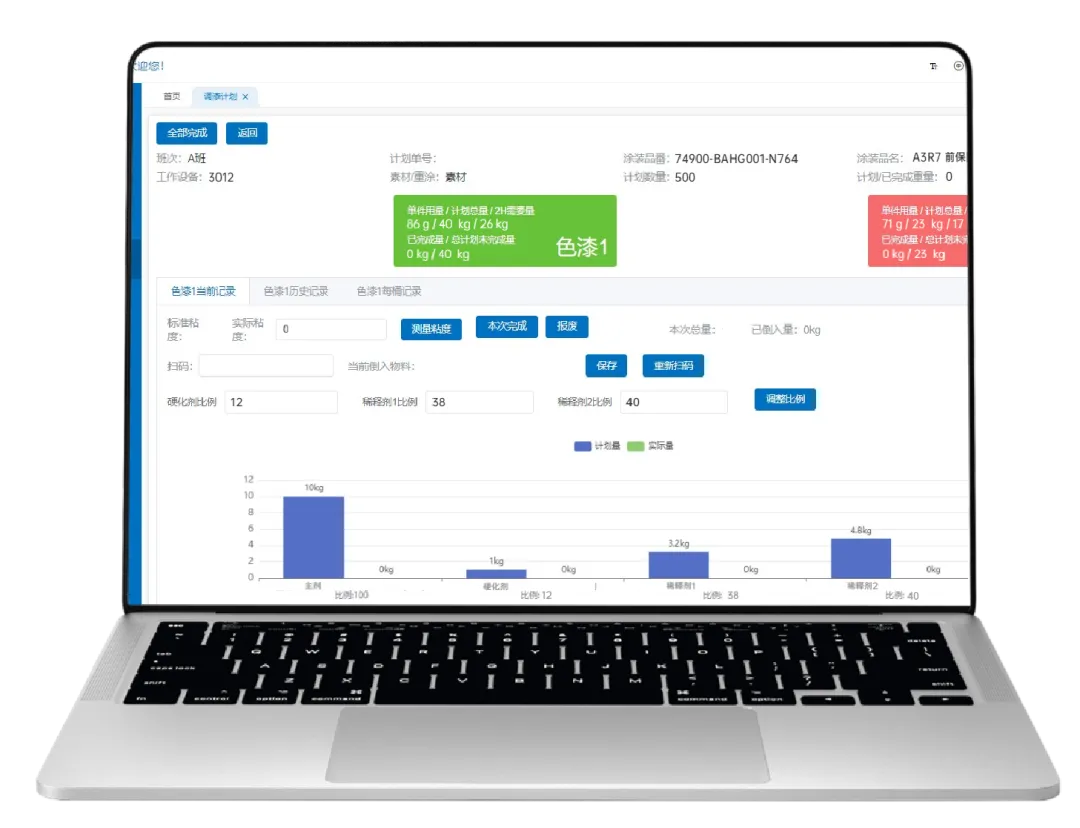 系統(tǒng)指導(dǎo)操作員按照標(biāo)準(zhǔn)工藝流程進(jìn)行調(diào)和,實(shí)時監(jiān)控調(diào)漆過程以防止錯誤操作。