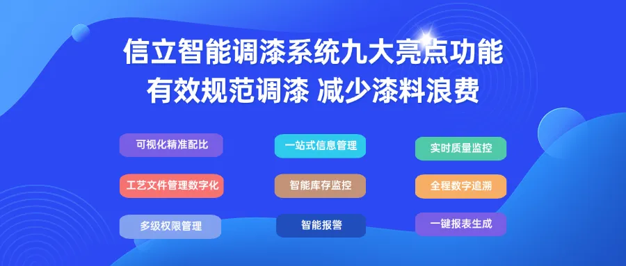 信立智能調(diào)漆系統(tǒng)XPMS,九大亮點(diǎn)功能設(shè)計(jì),逐一解決調(diào)漆過程固有問題,降低對人的依賴,減少漆料浪費(fèi),更準(zhǔn)確完整地計(jì)算統(tǒng)計(jì)漆料的使用及產(chǎn)出。