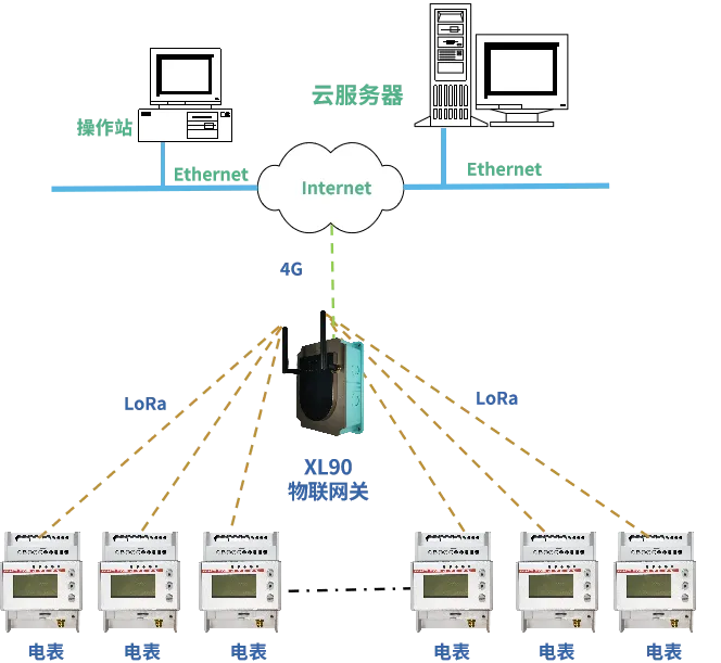 DTSD3366XL無線多功能電表獲取數(shù)據(jù),通過LoRa無線傳輸方式上傳至XL90網(wǎng)關(guān);XL90網(wǎng)關(guān)計算分析讀取的能耗數(shù)據(jù),并通過4G無線通信方式,將數(shù)據(jù)上傳至監(jiān)控平臺。