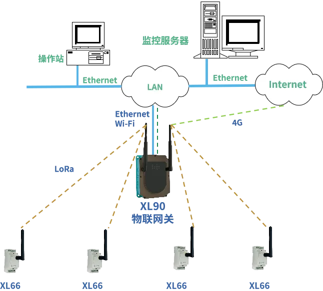 XL66串口無線轉(zhuǎn)換模塊通過LoRa將數(shù)據(jù)無線傳輸至XL90物聯(lián)網(wǎng)關(guān),網(wǎng)關(guān)通過以太網(wǎng)、Wi-Fi上傳數(shù)據(jù)至監(jiān)控平臺(tái)、PLC、觸摸屏、控制器等設(shè)備,或通過4G無線上傳數(shù)據(jù)至云平臺(tái)。