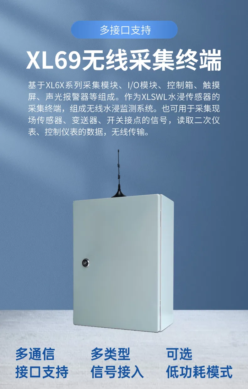 選擇XLSWL水浸傳感器和XL69無線采集終端,組成無線水浸監(jiān)測系統(tǒng)。