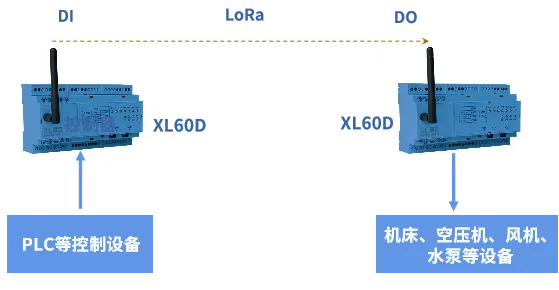 一對(duì)XL60D無(wú)線開(kāi)關(guān)量對(duì)傳模塊,其中一臺(tái)與PLC等控制儀表連接,作信號(hào)發(fā)射端;一臺(tái)配置在生產(chǎn)現(xiàn)場(chǎng),作信號(hào)接收端。發(fā)射端的XL60D將控制儀表的啟停命令,通過(guò)LoRa無(wú)線對(duì)傳到接收端,接收端的XL60D輸出開(kāi)關(guān)量信號(hào),控制設(shè)備啟、停。