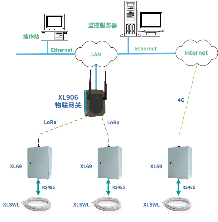 接入企業(yè)監(jiān)控平臺:XL69無線采集終端采用LoRa無線傳輸數(shù)據(jù)至XL90網(wǎng)關,網(wǎng)關通過Ethernet/WiFi等方式接入監(jiān)控平臺;